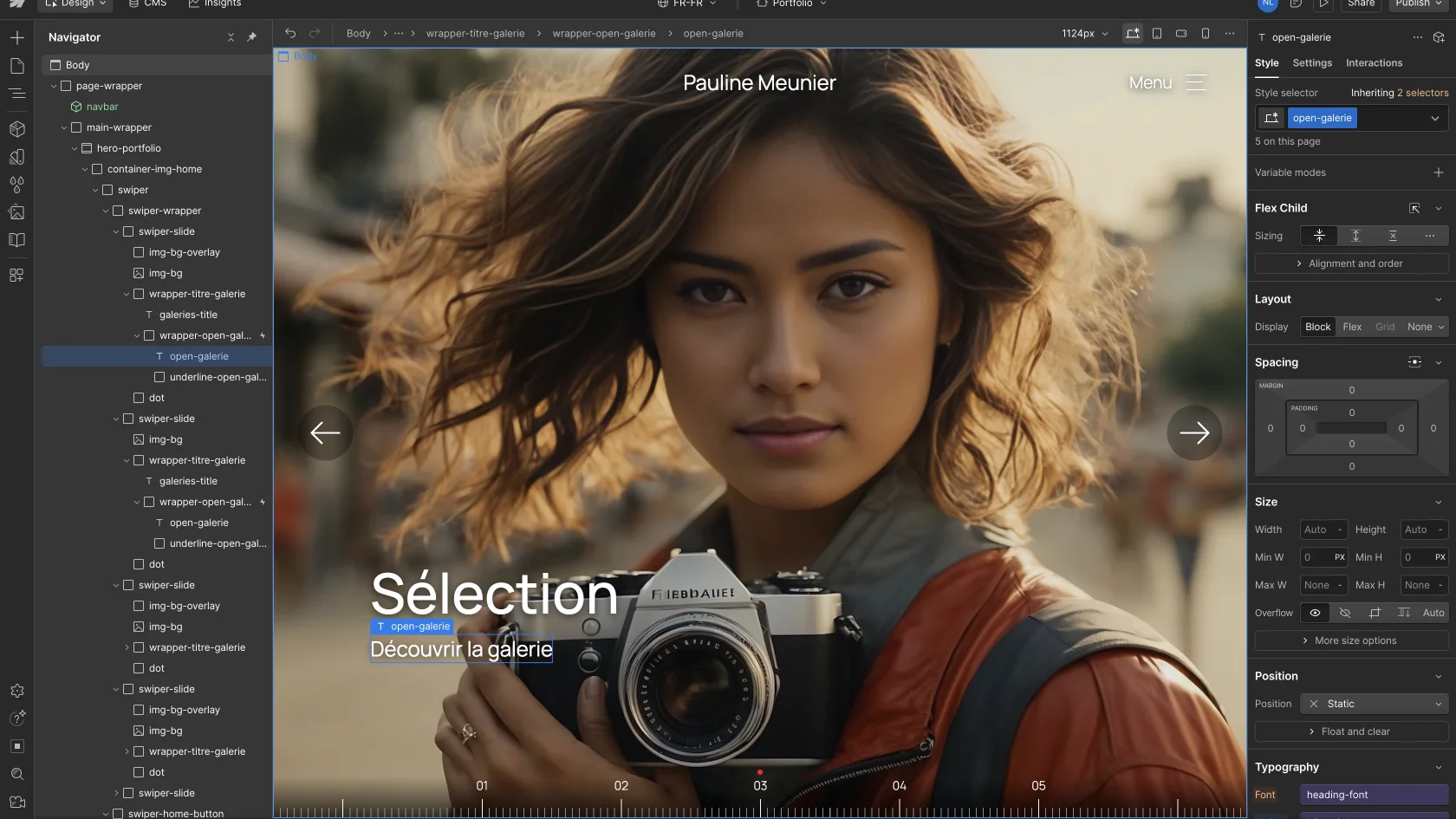 - 4. L'intégration et le développement : Une fois les maquettes validées, je passe sur Webflow pour l'intégration technique. C'est l'étape où le design prend vie avec des animations fluides et un code optimisé.