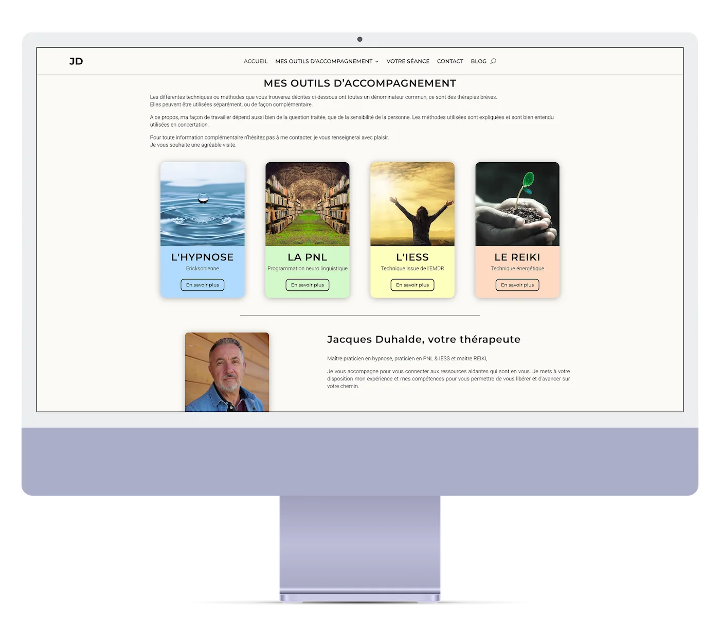 Jacques Duhalde accompagne ses patients à travers des séances d'hypnose, de PNL et de traitement des traumatismes dans la région d'Annecy. Il disposait d'un site vieillissant qui ne répondait plus aux standards actuels du web, notamment parce qu'il n'était pas adapté à la navigation sur mobile. Pour refléter le sérieux et la bienveillance de son accompagnement, il m'a confié en 2023 la refonte de sa présence en ligne. L'enjeu principal était de repenser totalement l'interface pour offrir une expérience utilisateur (UX) fluide et intuitive, tout en modernisant son identité visuelle avec la création d'un nouveau logo.